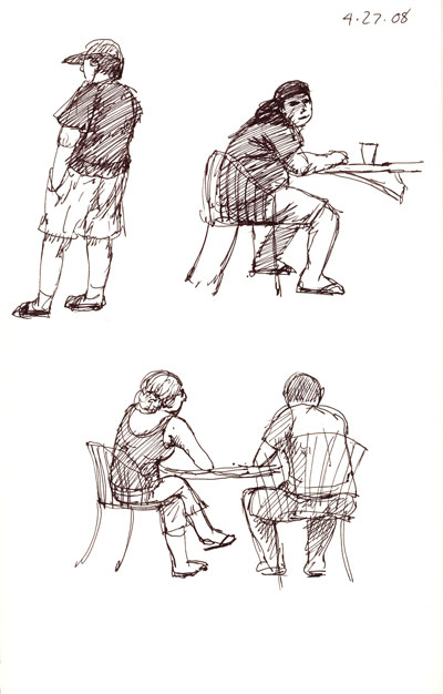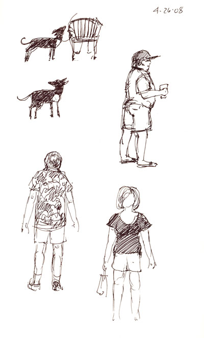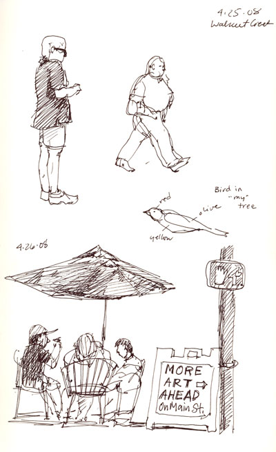 The main action was on Main Street. I was one street over on Locust on a corner space with a nice shade tree. As is usually the case, there was an ebb and flow of people, so I did some sketching. Haven’t done this kind of thing in a long time, so it was good practice. Here are the four unedited pages that I did. Maybe it will encourage you to try it. None of them took more than a few minutes at most.