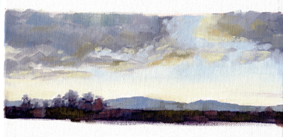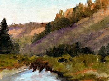 Then I went to Scott Christensen’s ten day plein air intensive. Four color palette (plus a couple of tube greys): titanium white, Rembrandt Permanent Red Medium, Winsor Newton (W/N) Ultramarine Blue and Winsor Newton Cadmium Yellow Pale. And my “color choices” exploded. I discovered a whole world of more muted, restrained color that I was barely aware of before. A limited palette solves the “color harmony” problem, too, since every color probably has at least a titch (the technical term) of all the others in it.