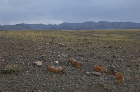 The Gobi Desert near my ger camp. Useful elements: cloudy sky, distant mountains, September grass, lay of the land, gravely surface, rocks with red lichen.