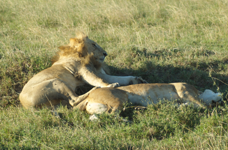 “Now the light was fading fast. We had to hurry to reach the gate before 7 pm, but just as we were leaving the plains, Dave said urgently, ‘Stop! Stop!’ Thirty yards from the road, a lion and lioness stood silhouetted by the setting sun. She moved against him, rubbing her body on his great shaggy main, and twitched her tail high in the air. Then, blatantly sensual, she crouched on the ground and the big male mounted her. The coupling was brief and ended with a climax of impressive snarls before she rolled onto her back in evident satisfaction.”