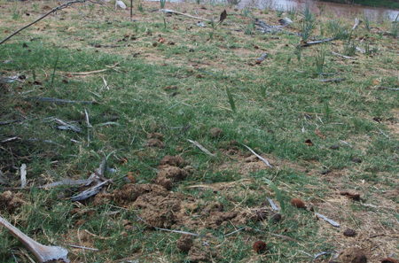 On the banks of the Ewaso Ngiro river in the Samburu, northern Kenya. We have: a little of the water for context (where did I take that picture?), grass, some kind of spiky leaved plant just coming up (needs to be identified), doum palm nuts and frond droppings and…..elephant dung. This was taken right in camp.