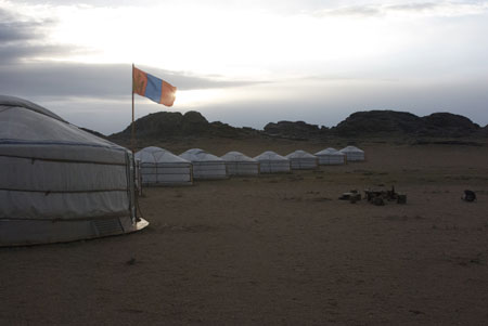 It wasn’t particularly cold, but as the day wore on, we saw damp areas start to appear in the cloth covering that faced the wind. Finally some water started to drip in in spots. The gers are covered with what our guide called “Russian canvas” for waterproofing and it mostly worked. Tuya, our guide, came back to the ger to chat after dinner and we could see that it was getting worse and worse. One of the camp guys came in and said that one of the other gers was dry, so we pulled together our stuff in about a minute and moved. A fire was quickly lighted in the stove (wood and dung) and we settled in for the night without any idea of how long the storm would last. For all we knew, we had driven six hours to sit in a ger for three days.
