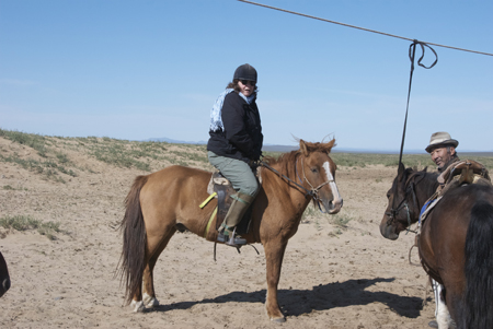The ger camp is pretty laid back. Activity options include trekking around the dunes and surrounding countryside, horse riding and camel rides. David and I opted for a one hour horse ride the first day (and a camel ride the second). I asked about the Mongolian saddles and it turned out that they had a modified one for me to use. It didn’t have the big silver studs on the sides of the seat, but did have a thin felt pad. Otherwise it was basically the same saddle the Mongols have used since the time of Chinggis Khan. And it wasn’t uncomfortable at all for just a hour, even given that I have hardly ever ridden a horse. So, here’s David and I, ready to ride. It was great!