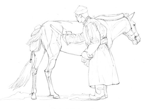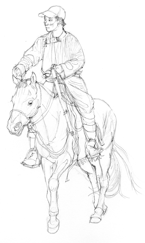 The first drawing combined two pieces of reference. One of the horse and one of the man. In the latter, he was in front of the horse’s head. In the former, I didn’t like the pose of the horse. Moving the man back works much better. The sweat from a winning horse is considered to be good luck. There are special scrapers made to remove it.