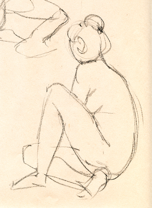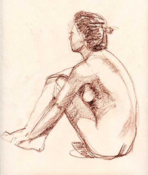 A little of each, I think. Here’s a progression of five drawings, starting with a thirty second gesture drawing and working up to the final 15 minute study. Needless to say, I highly recommend this to every representational artist, no matter what your subject matter. The human figure is endlessly challenging, but the point is less to turn out pretty drawings than to hone and train your eye.