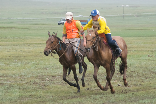 I loved everything about this image: The two horses neck and neck. The fact that one boy is using a traditional Mongol wood saddle and the other is riding bareback in stocking feet and how different it makes their body positions as they ride flat out for the finish line. The way the orange and yellow is repeated in their clothes and the saddle.