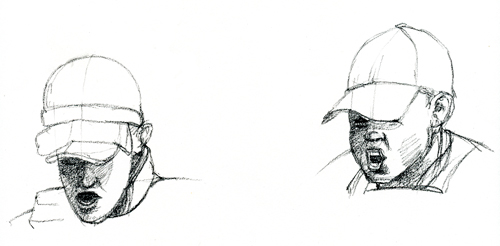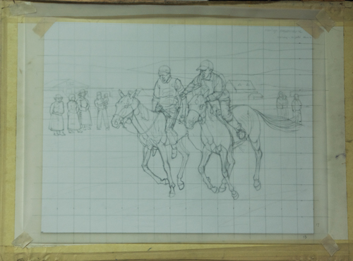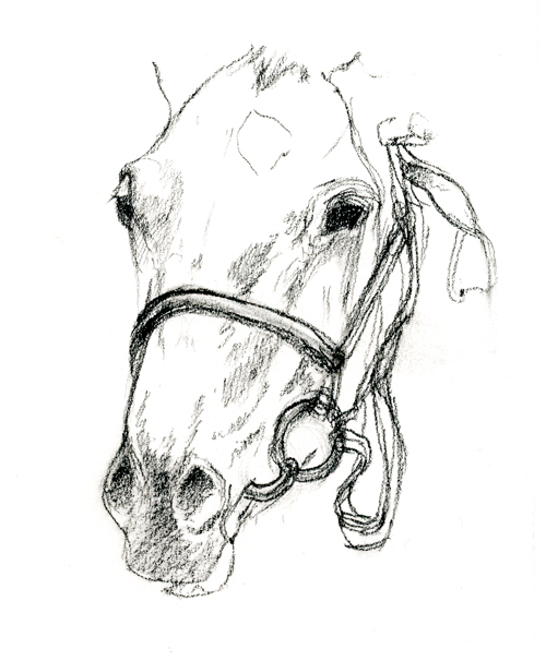 At one point, I stopped, got a piece of paper and a charcoal pencil and did a couple of studies of the boys and the bridle of the horse on the right to make sure that I understood the shapes correctly and could paint only the ones I needed.