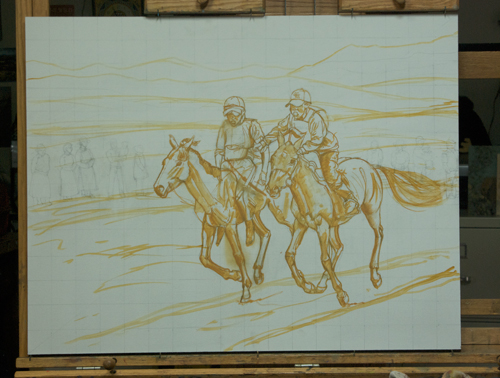 Here’s a detail of the people and buildings in progress. The good people of Erdene would probably be really confused if they saw this because I’ve used my “artistic license” to move and rearrange the structures to suit me. But I’d like to think that they’d recognize their friends and neighbors. Unfortunately, the pattern on the one woman’s blue del ended up being too visually distracting, so I had to make it just a plain blue. All the colors are intended to relate to each other in a somewhat limited palette and not compete with the jockeys. Oh, and that’s the Mongolian flag at the top of the blue building. Couldn’t leave that out. Notice also that I’ve added the road that runs through the town.  It’s on a diagonal, which is more dynamic than a horizontal. I want it to support and emphasize the main action. That’s also why the lines of dirt at the horses feet are on the diagonal, as you can see in the image above.