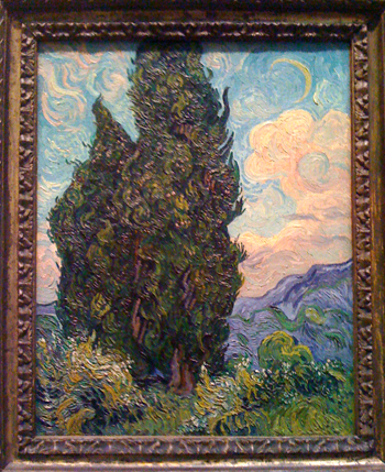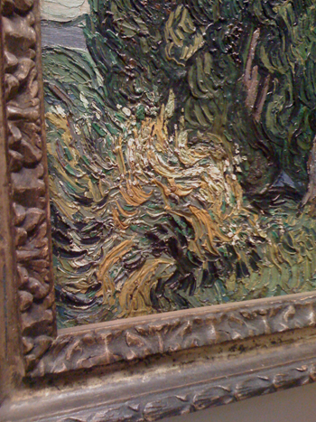 But what I think is missing almost the most is that a painting has a visual texture, sometimes subtle, sometimes not. Printing an image of a painting on a flat piece of paper eliminates that aspect completely. As an admittedly dramatic example, here is a Van Gogh. First the whole work. Then a detail shot at an angle that shows how the paint was applied. When he put it on this thickly, the painting almost becomes a live thing.