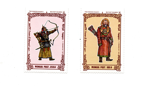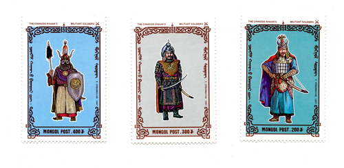 Continuing with a look at some interesting Mongolian postage stamps, this week is a set of what the text at the top of them says (in English, which is convenient) are “The Chinggis Khan’s Militant Soldiers”.
