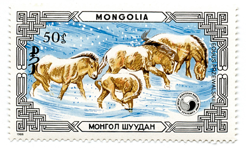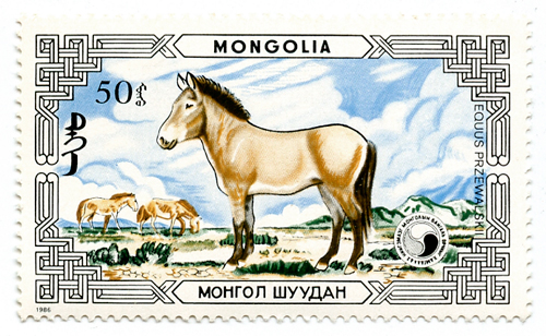 Takhi are the only remaining species of true wild horse. What Americans call “wild horses” or mustangs are really, simply, feral domestic horses. The two species diverged around 500,000 years ago, so the takhi is not the ancestor of modern horses, nor have any ever been successfully tamed, other than a few instances where a young horse was taught to tolerate humans riding it for a short time. The last wild takhi was a stallion seen in 1969. Captive animals started to be reintroduced to Mongolia in the early 1990s. Being a horse culture, the Mongols are very pleased to have takhi in their country again. And it’s not a surprise that they have been featured on a set of postage stamps.