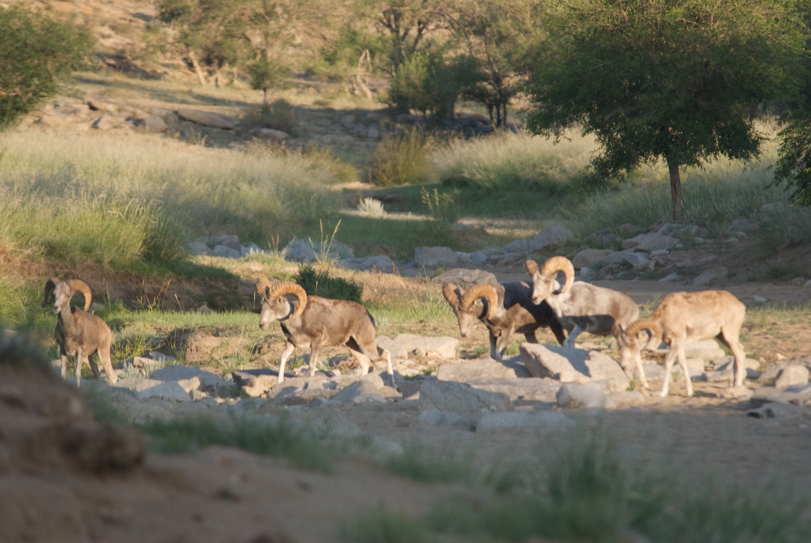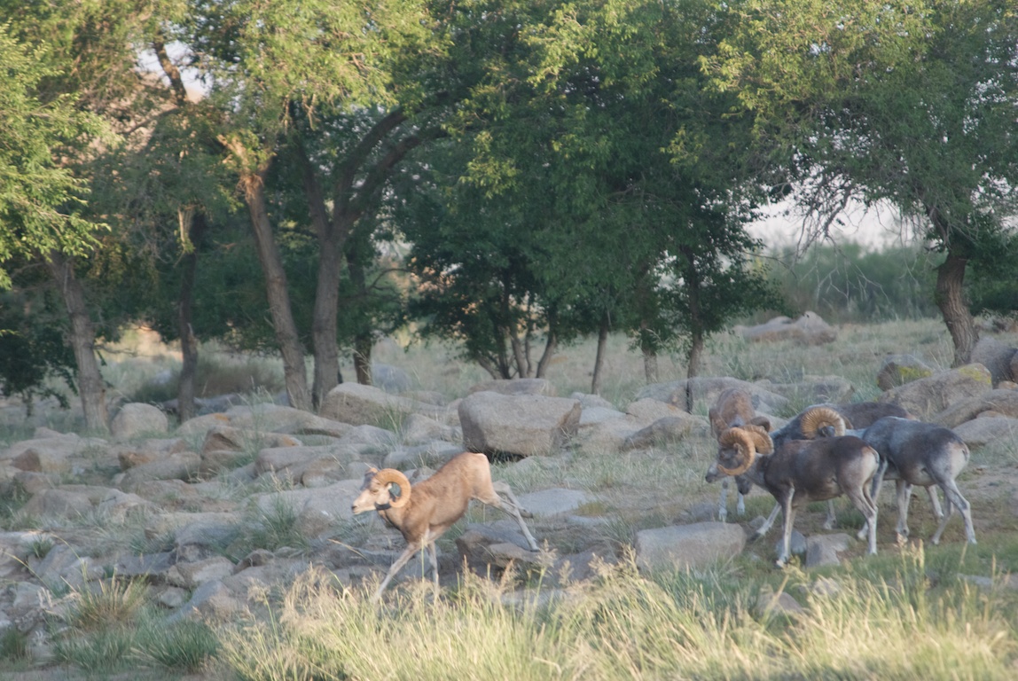 The first three crossed the stream bed to a small clump of trees. Two more rams had come down from the cliffs on the right. The Sunrise Boy’s Club was now in session.