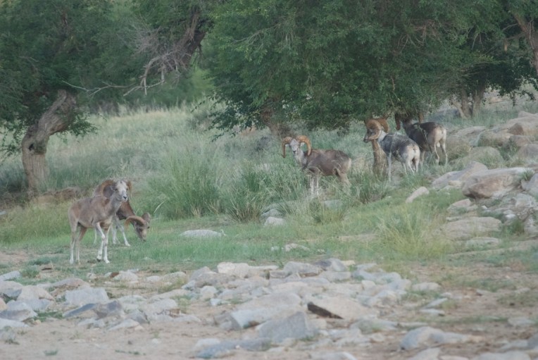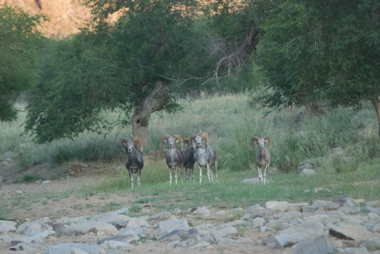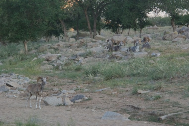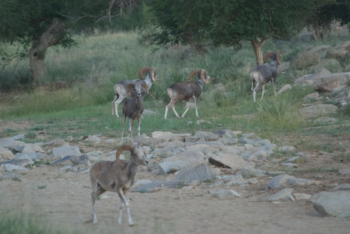 There were three older adults with massive horns and two younger rams. The big guys were almost grey, their juniors a reddish-brown.