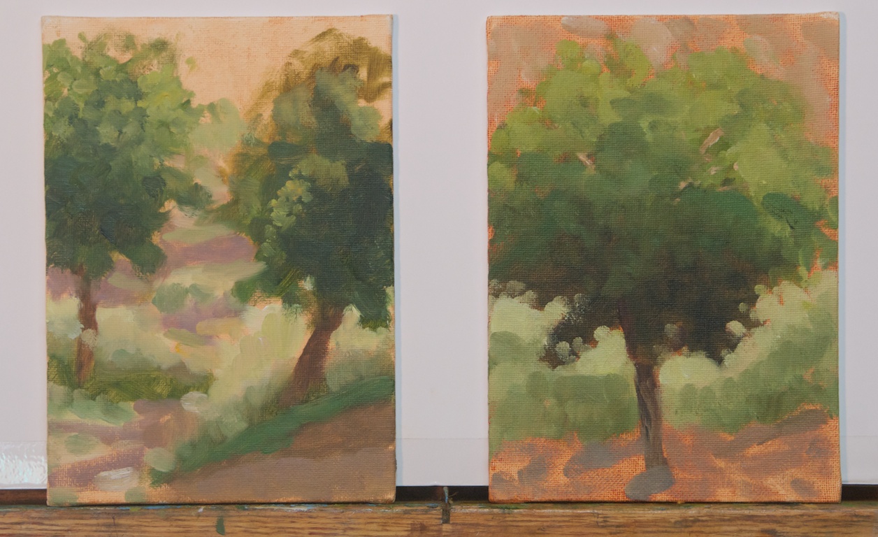 The central tree has a cast shadow. This is something that has given me trouble in the past. The shapes, edges and value relationships have to be just right. So I did a couple of studies of just that tree, along with another to figure out some of the same things where the stream bed goes back into space.
