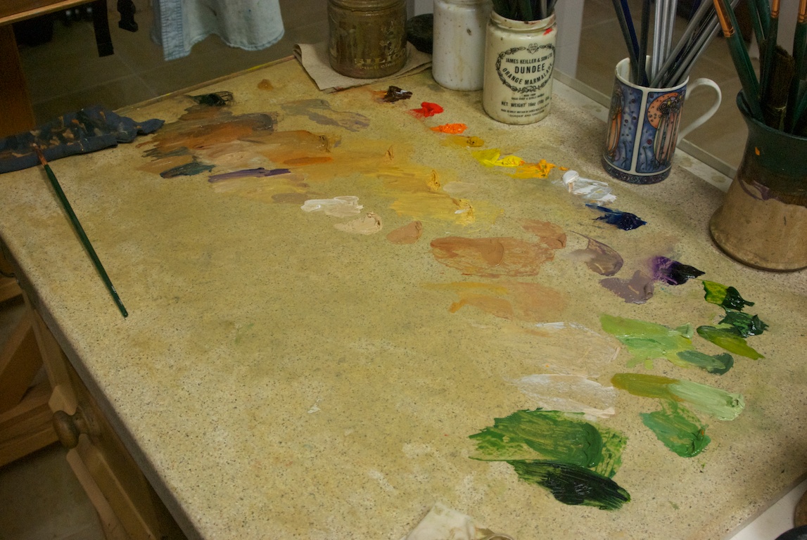 The palette itself is a scrap of Swanstone solid surface countertop. I got the idea from another art blog and I like it much better than the glass one I’d been using.