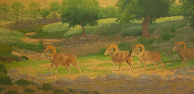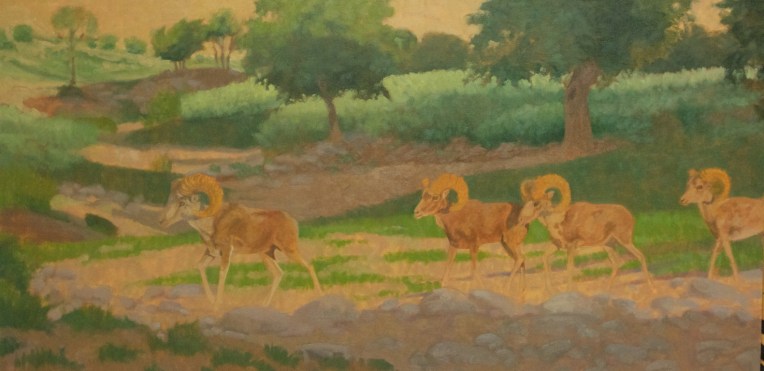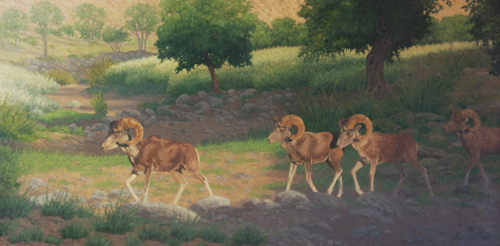 Continuing on from last week, I knew that I was going to do a big painting (big for me, at this point) when the five rams walked across the stream bed in the beautiful morning light.