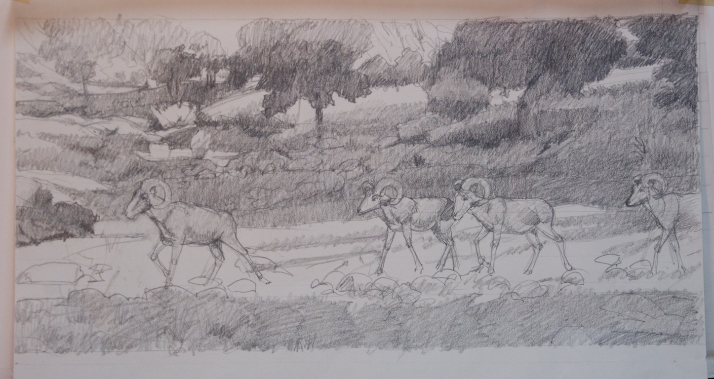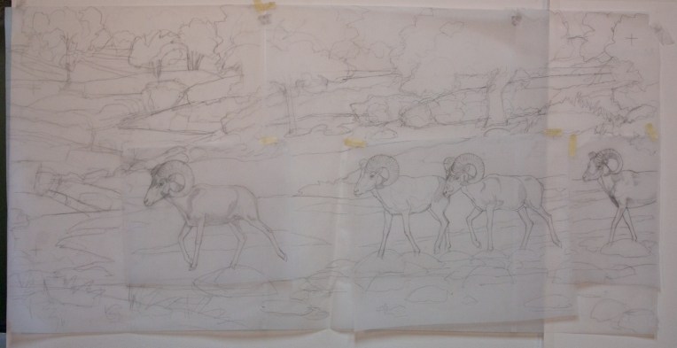 Once the background was laid in, I taped on three more pieces of tracing paper and did the final pencil drawings of each argali. Now I had this: