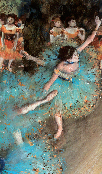 The Green Dancer (Dancers on Stage)  26×14 1/4″ pastel and gouache on paper