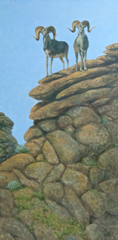 For the painting, I wanted to give a sense of the landscape that they live in and how comfortable they are on tilted surfaces that would make most of us somewhat nervous.