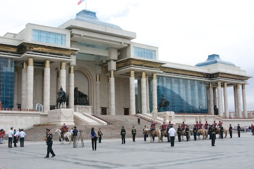 The horsetail standards are brought out of the Parliament BuildingSoldiers on matched palomino Mongol horses ready to take the standards to the Naadam Stadium; one of the Best Government Buildings Ever, which includes a big statue of Chinggis KhanLadies who had been in a traditional clothing fashion show watched from the sidelinesThe horse tail standards are set in place for the duration of NaadamThe President of Mongolia addresses the crowdThere was a parade of famous athletes and celebrities; I was told this man is a very famous wrestlerWhere else but Mongolia? In comes the Mongol Queen and her warrior entourageA display of the national flag; on horseback, naturallyThen it out to the valley for the horse race; almost to the finish lineI was told that close to half the population of the country was in and around this valley that day; judging from the traffic we hit getting there, I can believe itBack in UB, a mom starts her little one off rightThe winner of the archery competition, a Buriat man, accompanied by his wife, both looking great!Then it was my turn. For about a dollar, I got to shoot a real Mongol bow and arrow and got a pretty good distanceMongol wrestling (Bokh) is pretty simple- first wrestler to have a body part touch the ground other than the feet loses- but within that simplicity are endless subtle complexities; I'm definitely a fanGoing down....