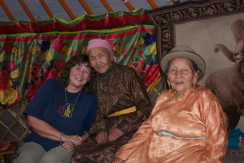 Lunch up in the mountains of Hustai National ParkMongol horse ride #1 at Arburd Sands ger campStupa at Zorgol Uul, a mountain not far from Arburd SandsProbably my favorite photo from the trip; I met these women in 2008 when my husband and I went to Arburd Sands and I was thrilled to see them again this year; Lkhamsuren, on the right, is the widow of famous horsetrainer, Choidog, whose son, Batbadrakh, is now family patriarch; Surenjav, next to me, and I somehow connected in 2008 even though we couldn't talk to each other due to the language barrier. She's 92 now and is Batbadrakh's brother's mother-in-law. Being Mongolia, neither expressed any real surprise at this western woman who they met three years ago walking into the ger one morning to say "Sain bain uu"Orphaned argali lamb at the Ikh Nartiin Chuluu Nature Reserve research campHappiness is a nice ger and comfy del at Gun-Galuut Nature ReserveAfter the second longish hike up a steep slope in one morning, I was rewarded with this great view of the valley of the Kherlen Gol; Chinggis Khan almost certainly knew and rode through this placeMongol horse ride #2 at Jalman Meadows ger camp, up north in the Hentii Mountains, and overlooking the valley of the Tuul Gol, which also flows through UlaanbaatarThe second night of the camping trip, I got to stay overnight with a herder family for the first time. It happened to be the home of my driver, Puugee, who on the right. Next to me on the left is Hashchuluun, his wife, then a lady who I did not catch the name of and, finally, Puugee's oldest son, one of three