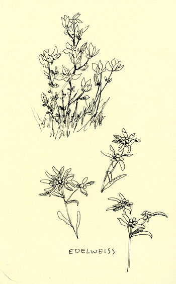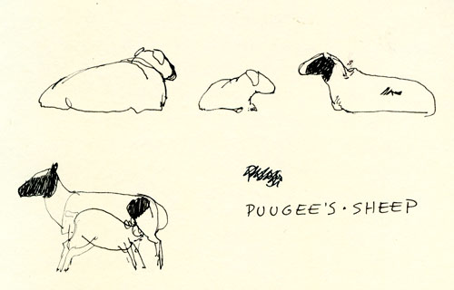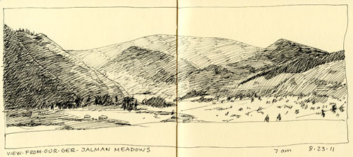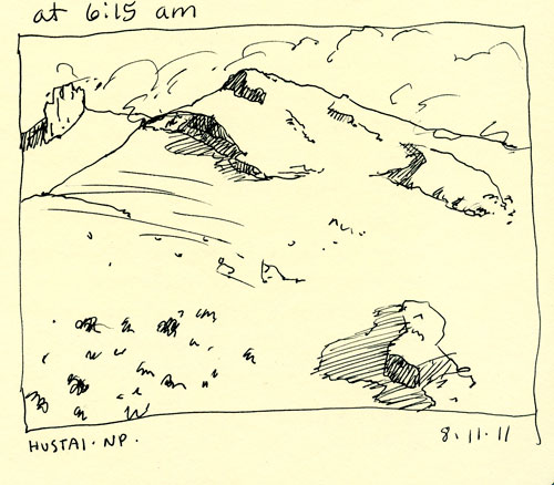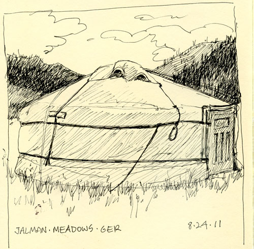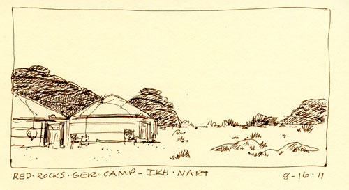 First are the ones I did in my Moleskin sketch journal. They were pretty much all done in five minutes or less for the small ones and maybe twenty for the one that crosses both pages. Some were done during lunch stops, some at camp between drives. The cows and sheep were done at the home ger of my driver, where I got to stay overnight. That wonderful experience will rate its own post: