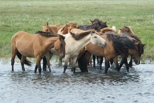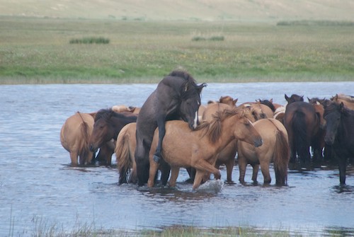 The horses we got great photos of, with the ger camp in the background; they were in the water to get away from the mosquitos