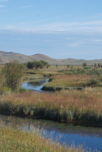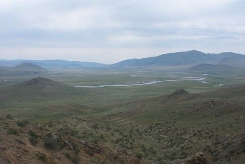 We drove to the next draw over where we hoped the argali rams had gone, but saw no one. Pokey wanted to do some sketching, so she stayed with the car while Khatnaa and I hiked up onto the mountain again. Coming around a ridge, the view opened up to the entire river valley. We found a couple of rocks to sit on and simply enjoyed the scenery for a half hour. It was so quiet, except for the occasional animal. No cars, no planes, no radios, no voices. Just. Quiet. One of the things I treasure about being in the Mongolian countryside.