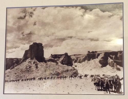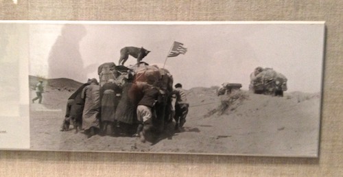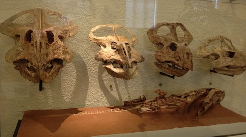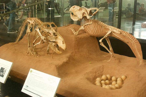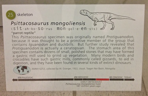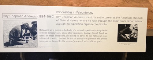 American flag carried to the Gobi of Mongolia by one of Roy Chapman Andrews’ Central Asiatic Expeditions.Closeup of the photo. I’ve helped push a vehicle or two on my trips, but without a dog to supervise.The walls in the cafe closest to the Paleontology section are lined with photos of the Central Asiatic Expeditions to Mongolia. This one is of what Andrews dubbed “The Flaming Cliffs” which are located in an area the Mongols call Bayanzag (Place of the saxaul trees). I’m pretty sure I watched the sun go down along the lengthy of this butt in September of 2006. He used large caravans of camels to transport supplies and get them into position before the rest of the expedition arrived in motor cars.Another photo from the cafe, this one showing the Expedition’s camp. The tents are “maikhan” or summer tents, which are lighter and even more portable than the better known felt gers.Short profile of Roy Chapman Andrews. It has been speculated that he was one of the inspirations for Indiana Jones. And if you’ve read his biography, that’s not hard to believe, although there is no proof.One of the fossils from Mongolia, a Psittacosaurus mongoliensisInformational sign about the above fossilProtoceratops fossil skulls of varying sizes; the expedition’s scientists found far more of these than any other speciesA pair of protoceratops (image from 2009)Although the Expeditions failed in their original goal, which was to find evidence that “man” had originated in Asia, not Africa, the find that electrified America was the discovery of the first known fossil dinosaur eggs. Andrews’ decision to sell one created a firestorm of controversy. (image from 2009)Besides the flag, this was the other item from Mongolia that I’d missed on my previous trip, an amazing fossil of a female dinosaur which contains a egg with a recognizable embryo, something never before seen or found.