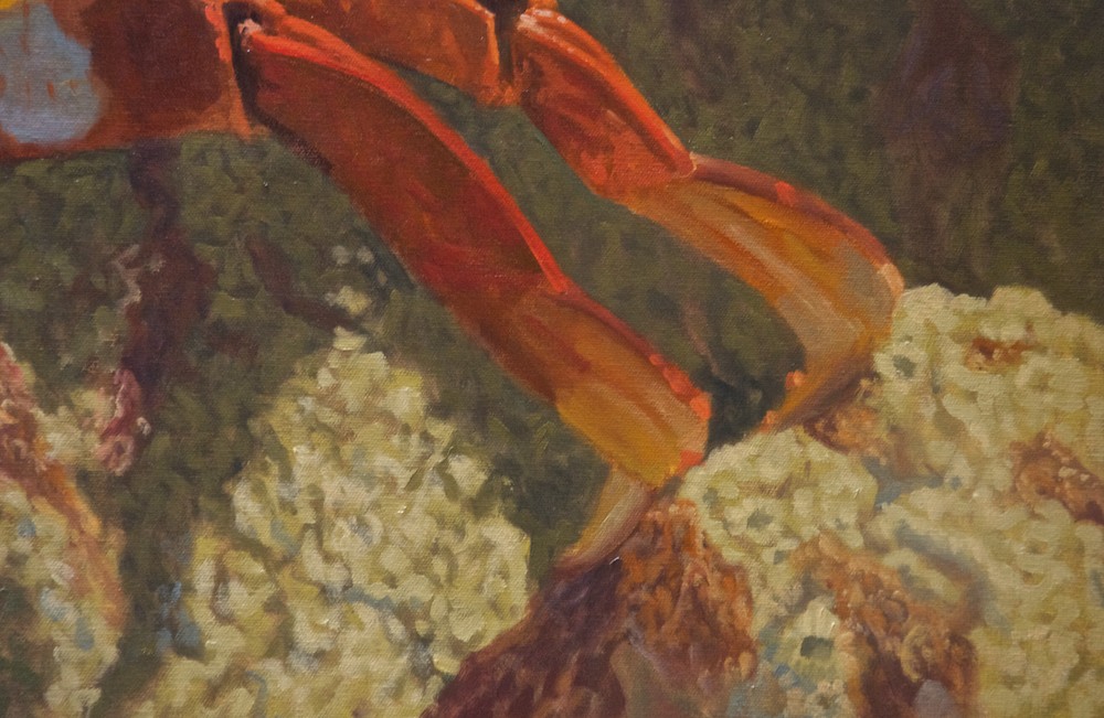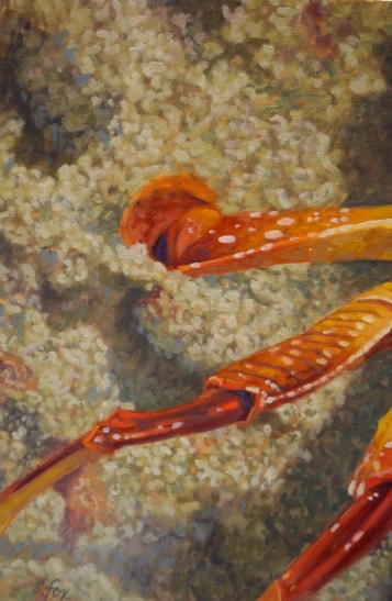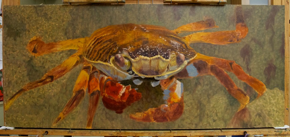 Here’s how I was able to get such great shots. We were able to get REALLY close to them.Reference photo; I knew from the beginning that I wanted to paint the crab BIG and crop in for a horizontal rectangle. I used other photos for comparison and to change the position slightly of one leg.Preliminary graphite study, 7×17″; to learn my subject, ensure that the composition worked and to establish the value patternColor rough, 6×14″; this is a really different color palette for me compared to the more restrained earth tones I use for my Mongolian subjects. Can’t remember the last time I used red and yellow pretty much right out of the tube.Grid transfer in pencil; Raymar canvas board is tinted with raw siennaThe brush drawing. I realized after I’d done the one from the pencil drawing that the crab wasn’t nearly big enough, so I wiped if off and re-drew it. By this time I’d done the graphite study and the color rough, so I “knew” him/her pretty well and it didn’t take long.First color passThis is a little more than half-way there. The next step was to catch the background up with the crab and then move on to the legs and claws and then go back and tweak everything until it was done.“Up Close-Sally Lightfoot Crab” 20×46″ oil