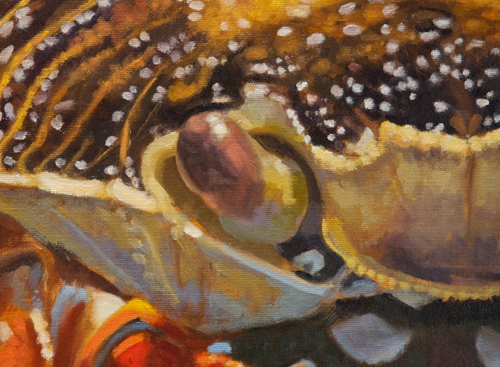 The crab was on a rock totally encrusted with barnacles. I had absolutely zero interest in painting 50 gazillion of them, so instead I analyzed the visual texture and values and then indicated those in a variety of colors and values.But just to make sure the viewer knows what they are, I did a few more finished ones in the lower right hand corner.The eyes were fun. The challenge was to get expression, to have the viewer feel that the crab is looking right at them.