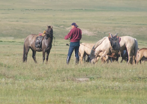 He rode on past us and we continued birdwatching and picture taking. Not too much later though, back he came, catching up with a brown horse, saddled and bridled, which had clearly gotten loose. In the meantime, a good-sized group of horses were heading for some open water. The brown horse dodged behind them with the rider right after him. Up came his urga (the long pole with a loop that is used instead of a rope lasso) and in short order the brown horse was captured.