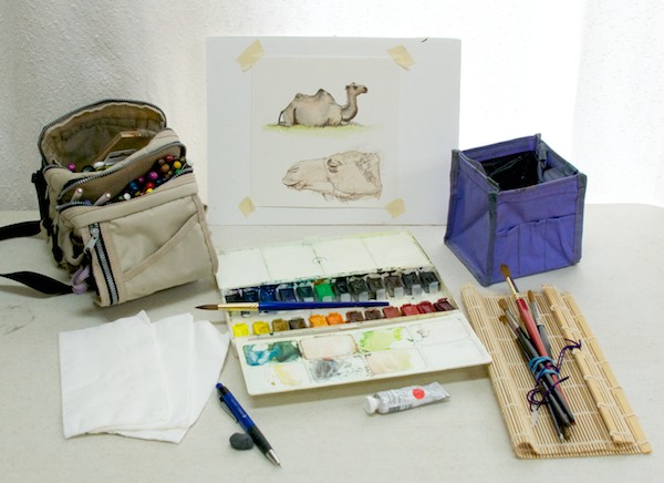The watercolor set is from Yarka. I use napkins, slightly used, from restaurants, for rags. Extra brushes go in the bamboo carrier. Water for painting goes in the collapsible plasticized cloth “bucket”.