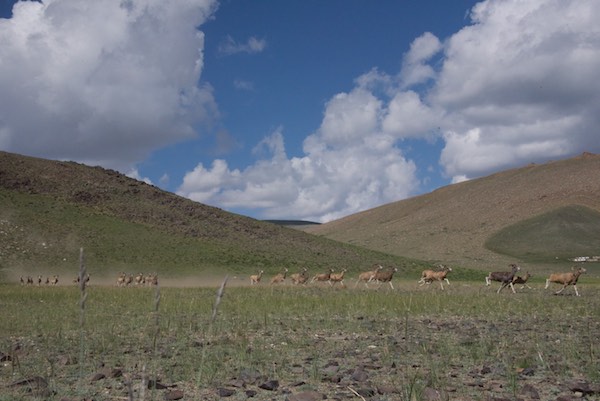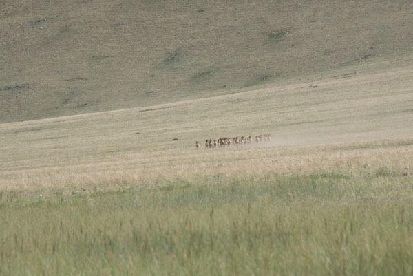 The huge herd just poured down off the hill. Anand, one of the rangers from Ikh Nart, who was acting as a spotter and not far from me yelled” Susan, get down!” So I ducked even lower behind my grass clump.