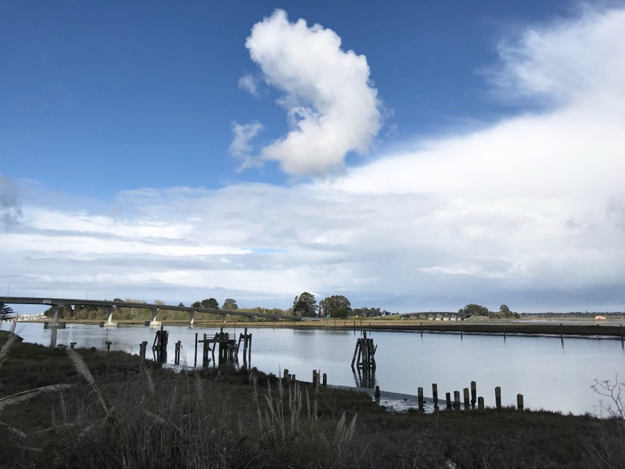 This past Sunday we had good weather (it’s been raining quite a bit) and drove up to the Redwood Creek levee at Orick. We like it for walks because the collies can be off-leash, we can see all around us, there’s almost never been anyone else there and the gravel walkway ends at the mouth of the creek so we’re right near the ocean. It’s about a three mile round trip.