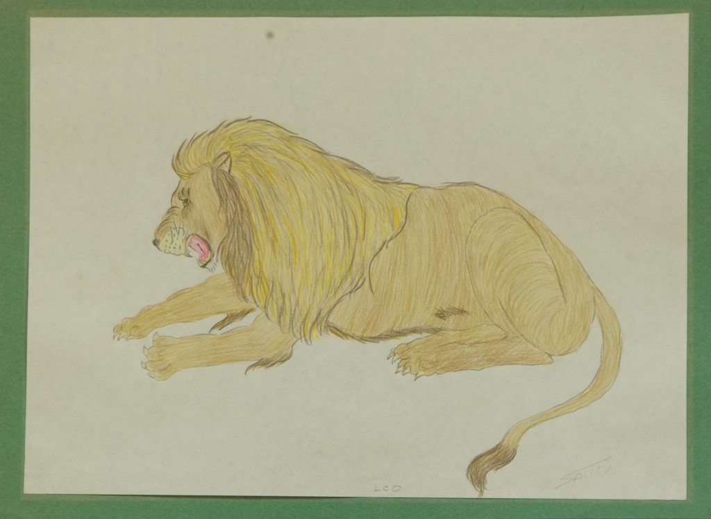 One of PILES of drawings I did as a kid. My dad brought home old business forms and I drew on the blank backs. I had an endless supply of paper, but ended up a little surprised to learn that one could get drawing paper that didn't have printing on one side. "Lion" colored pencil, 8.5x11"