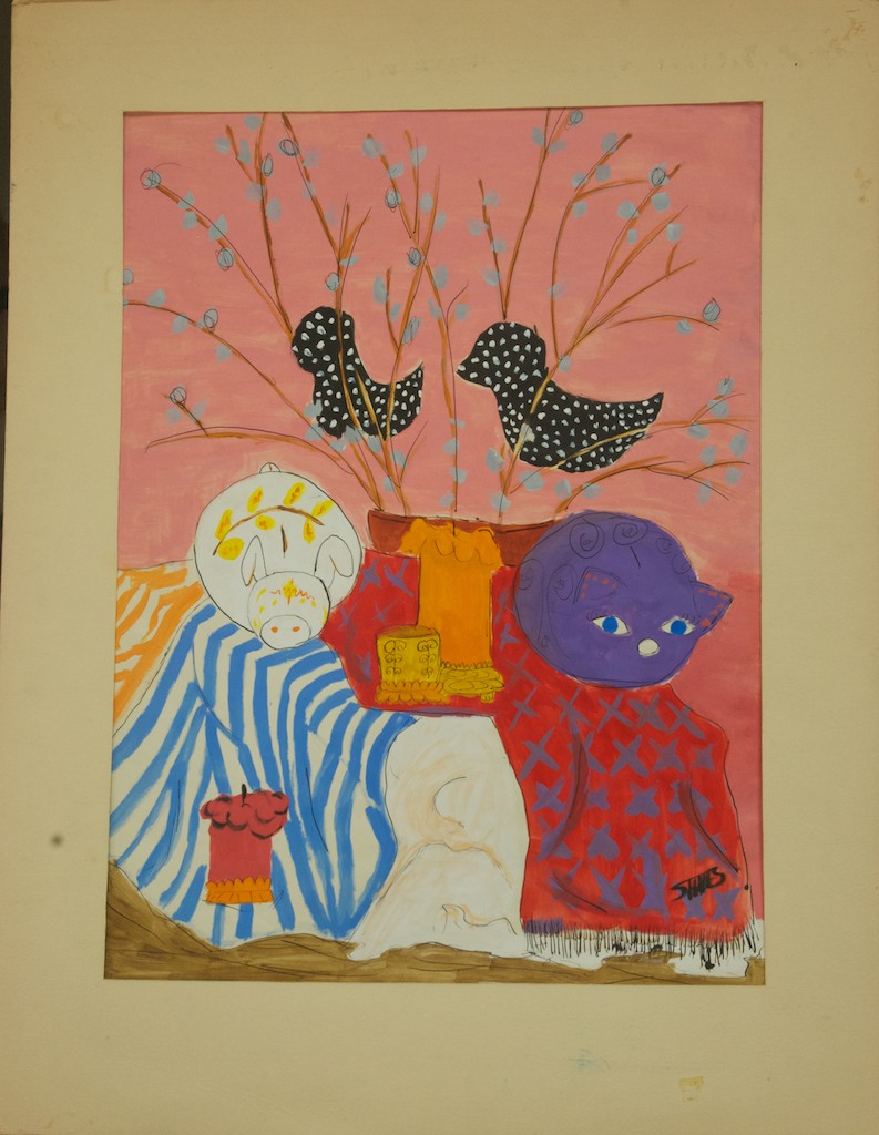 In the Illustration Department we had to do an illustration a week, every week. The first semester required us to use first pen and ink and also gouache. Below you’ll see some of the initial exercises we did. I was one of the very few who liked gouache and I was interested in greeting card work, much of which was painted in that media at the time, so I stayed with it all through school. The second semester was watercolor and dyes like Dr. Martin’s. From the third semester on we could use the media of our choice.