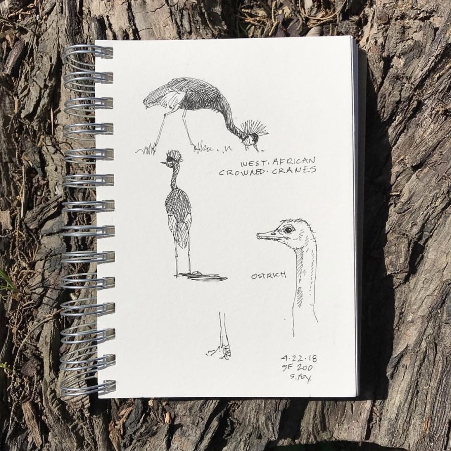 I returned home on Monday from attending the Explorers Club Lowell Thomas Annual Dinner in Santa Barbara, California. I spent a productive afternoon the day before the Saturday event sketching at the Santa Barbara Zoo, keeping it really simple: a 7×5″ Pentalic Nature Sketchbook and a Sakura Micron .01 black pen.