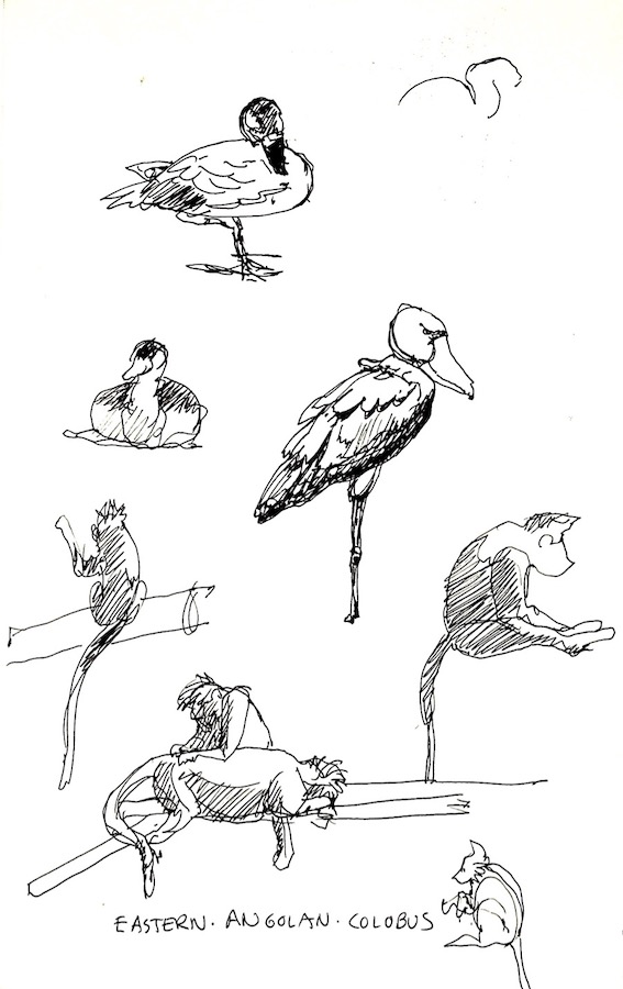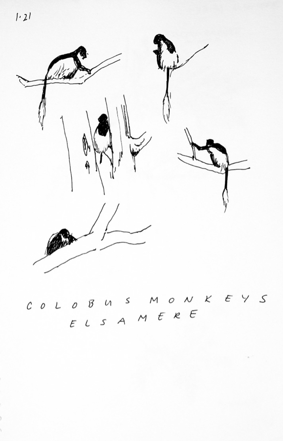 These colobus monkeys were fairly far up in the trees and jumping around so I simply and quickly sketched in the black bodies, leaving the white feathering the color of the paper.