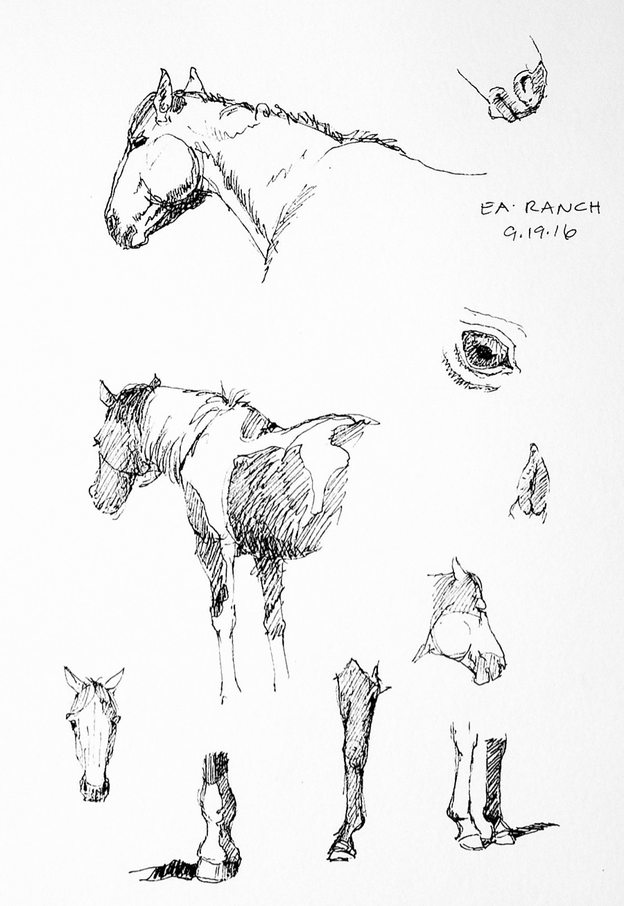 The horses were in a corral standing around, so I had time to add things like the pinto markings and do eye, leg and hoof studies.