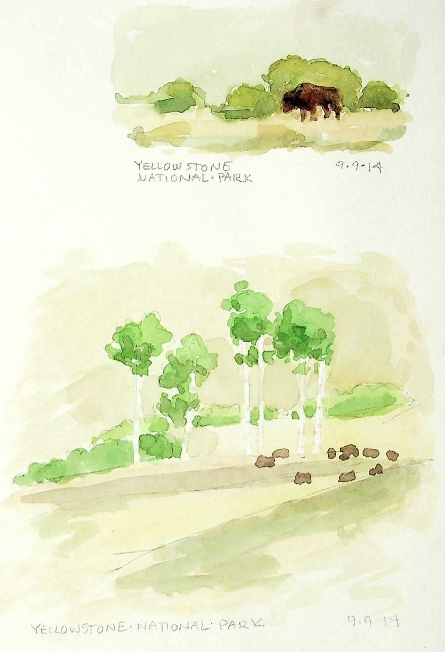 To give you an idea of what I’ve done over the years, here’s a selection from my sketchbooks. Some, like the animals were done very quickly, in maybe one to three minutes, sometimes less. The landscapes hold still so I can spend more time on them. And if I can add an animal, so much the better!