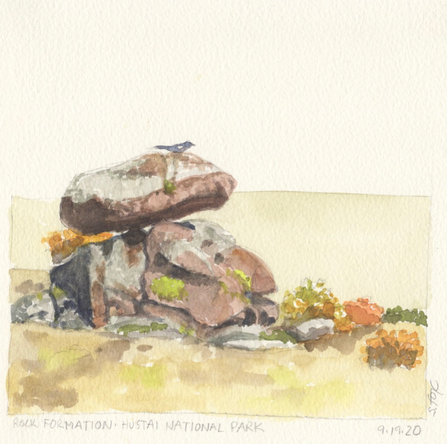 I was sitting on a rock at Hustai, painting this interesting and colorful small rock formation and the surrounding fall foliage when the bird, I think it was a magpie, landed on the top one. I dropped my brush, grabbed a pencil and quickly sketched it in.
