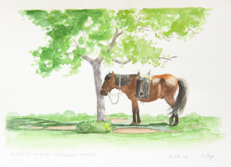 A local herder came by the ger camp I was staying at to help put up more gers and “parked” his horse right in front of mine. The horses are stoic about standing like this for hours at a time. He shifted around over the two hours I spent on this piece but always came back to this position. I had never done a watercolor of a live animal before, but he was a good model and once I got the drawing and shadow shapes down it was fun