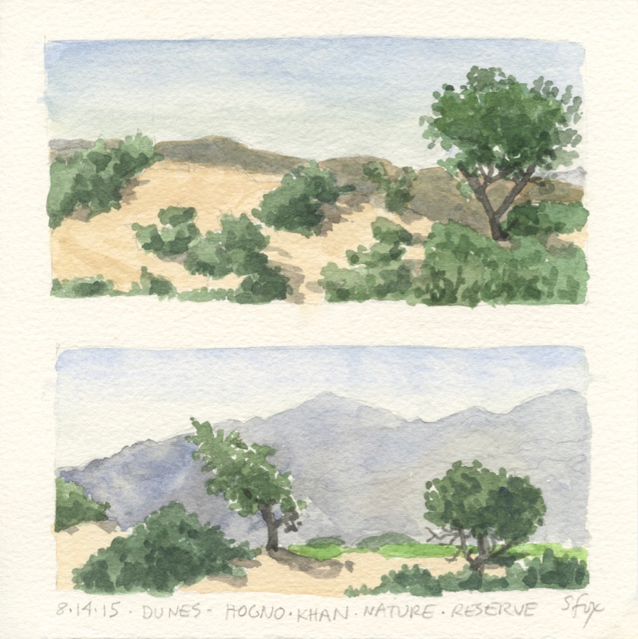 My last stop was Delger Camp in the Hogno Han Nature Reserve. I had arranged to be dropped off in the wetland/dune area to paint and decided to start with the clouds moving over the mountains of the reserve. They kept getting closer and closer and the wind started to come up. It started to rain and I took cover under a tree. As the front moved over me there were loud rumbles of thunder. Fortunately the driver, who is the brother-in-law of the camp owner, had left a mobile phone with me, a first and something I’ve never worried about having since there’s usually no service in areas like this. I called and managed to get through to the camp owner who had the driver, who’d gone into the soum center for gas and was too far east to have seen the storm moving in, come back and get me as quickly as possible. Other than getting wet, I was fine. It was the end of my painting day, but I do have this not-quite-finished one as a memory.