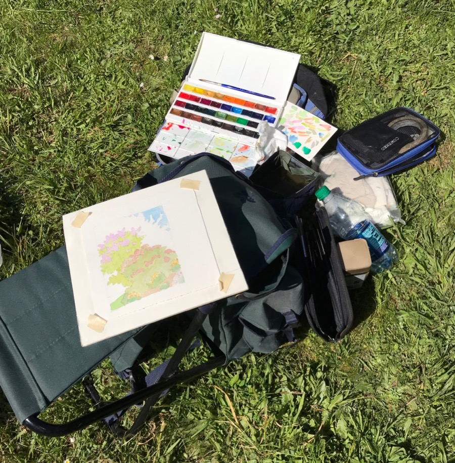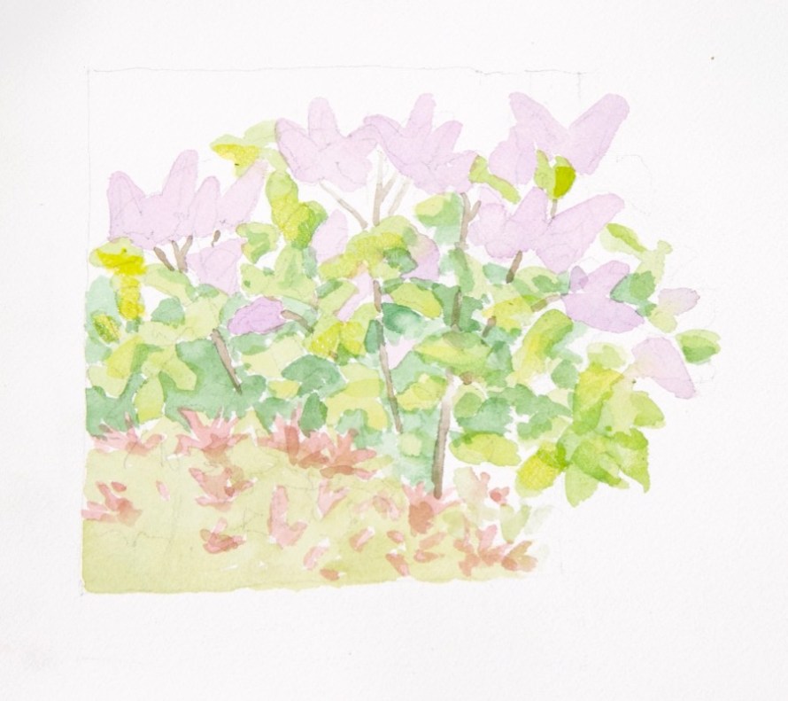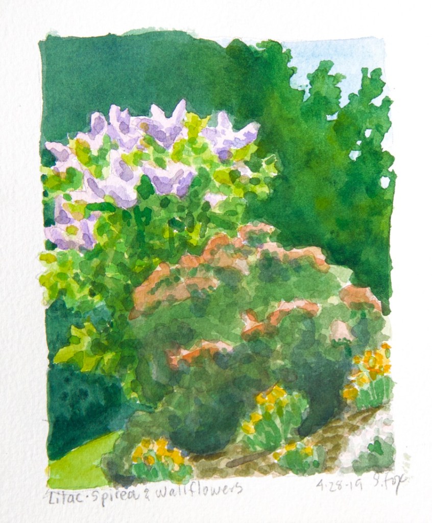 Spring has sprung so I’ve gotten out the past few days to paint and sketch in our garden. I use a Yarka full-pan set of paints, a variety of brushes and either a 9×12″ Arches cold press block or 8×8″ pieces of Sanders Waterford cold press taped to a piece of foamcore with taped edges.