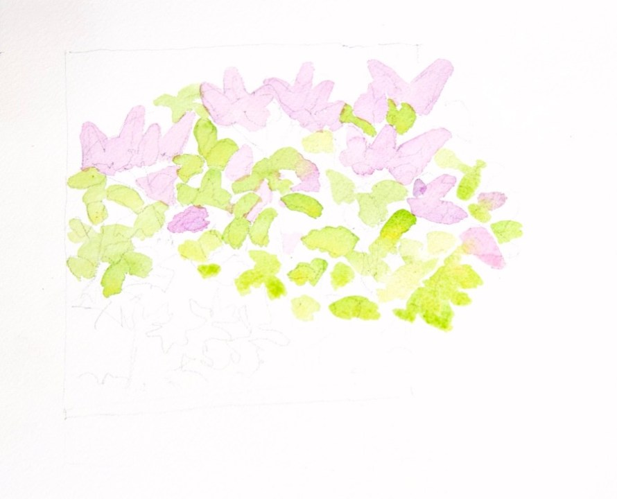 As you can see I treated the lilacs as simple shapes, not getting into painting individual flowers. I also paid attention to color temperature, starting warm in the lightest area and going cooler in the shadows.