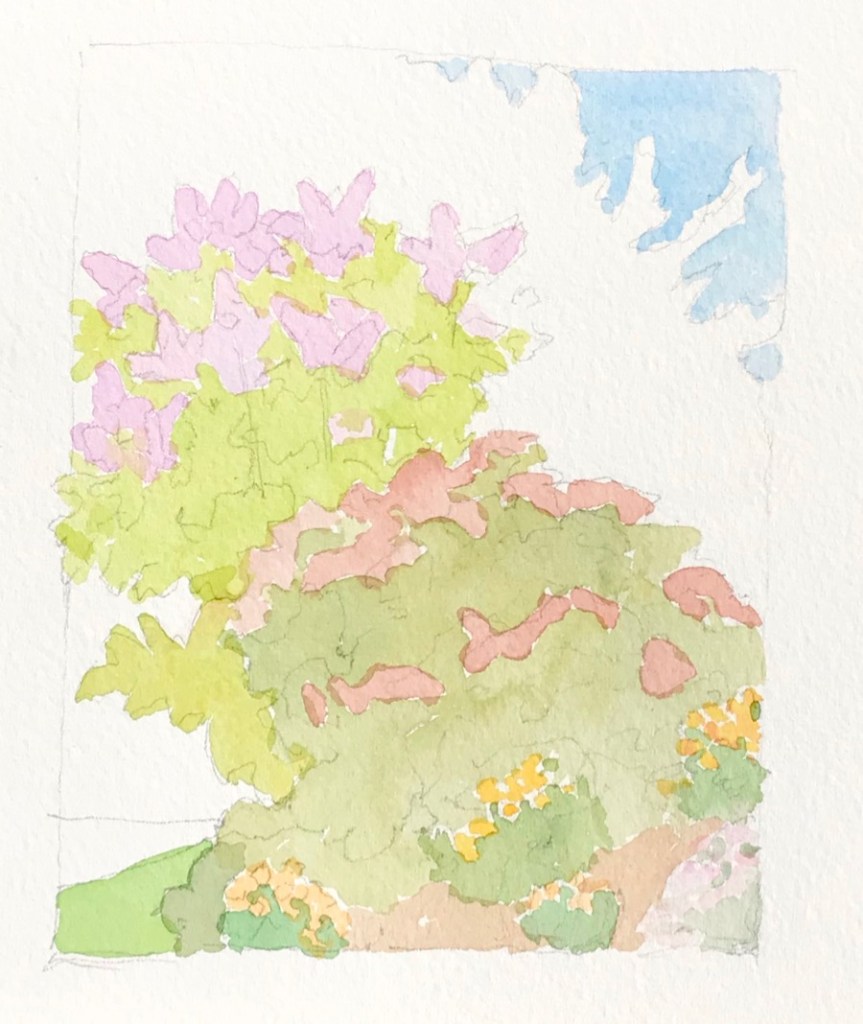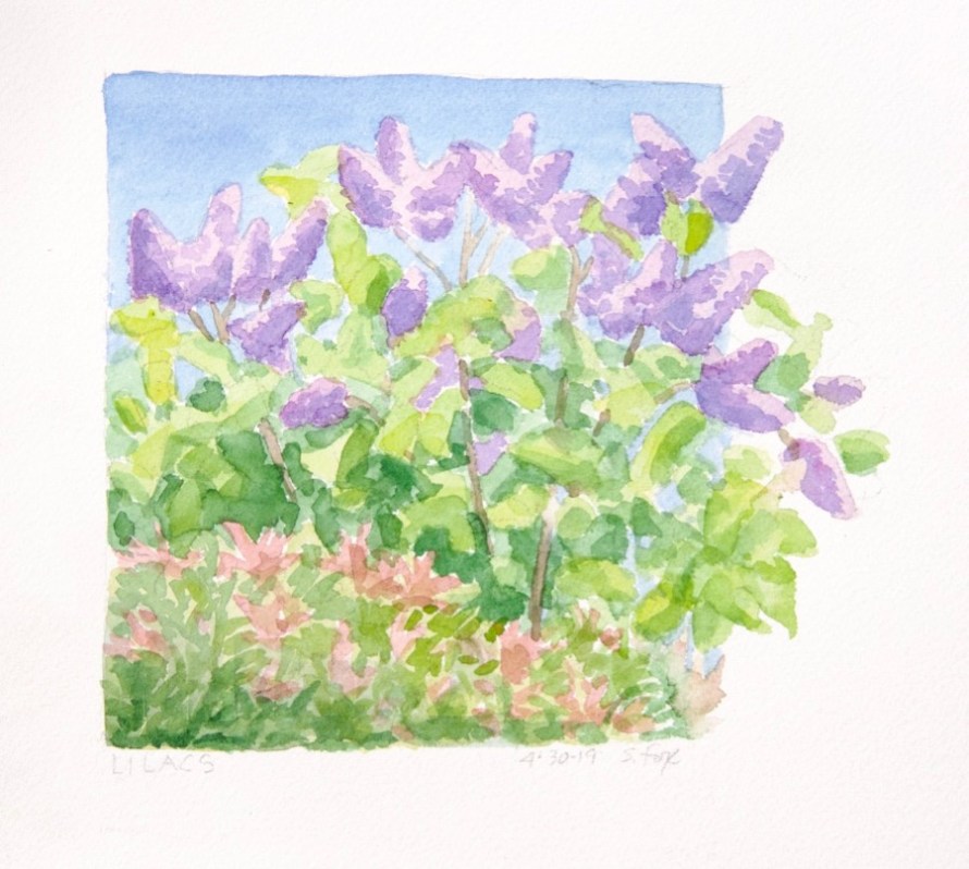 I got so involved in what I was doing that I forgot to take any other step photos of this first one. My goal was to limber up for the painting season and catch the lilacs against the dark green of the English laurel behind it. I stayed with really simple shapes working, as one does with watercolor, from light to dark.