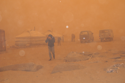 Typical spring dust storm, Ikh Nartiin Chuluu Nature Reserve research camp, April 2005; photo taken out the door of the ger; circles are the flash bouncing off dust particles; the wind was howling, too