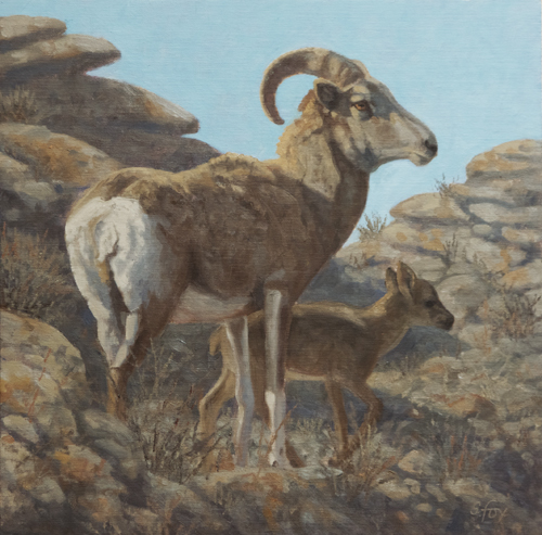 Argali Ewe and Lamb, Ikh Nartiin Chuluu; 12x12" oil on canvasboard
