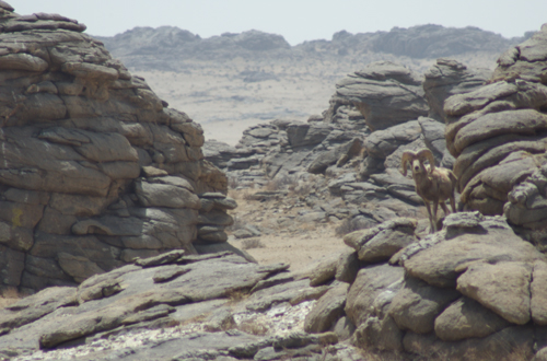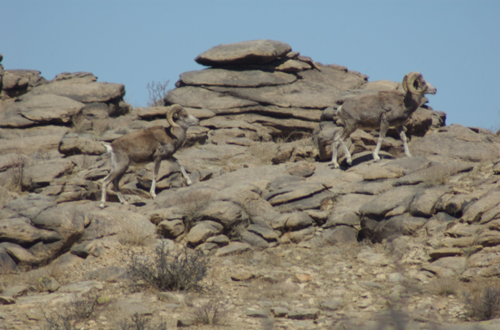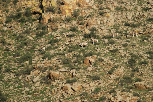 Rams on rocky hillside at Gun-Galuut Nature Reserve in 2009; the key to spotting them is to look for movement and those long, thin legs, which don't seem to quite fit the landscape; this was with my 80-400 mm lens (effectively 600mm on a digital body) at maximum zoom